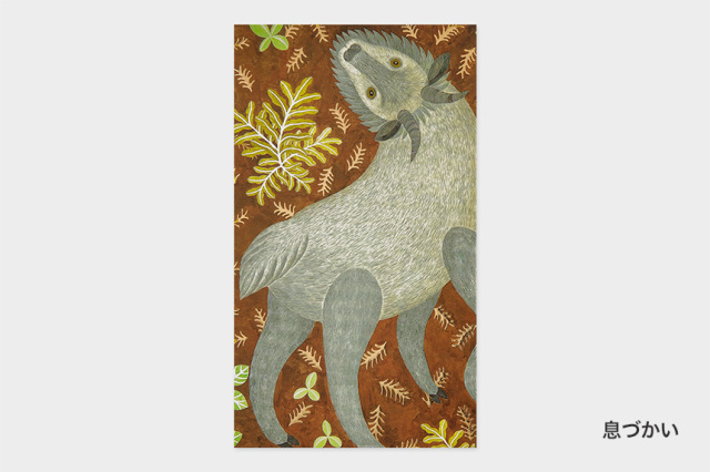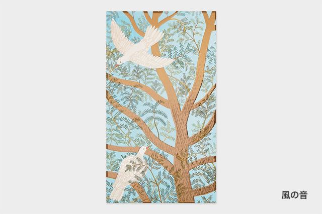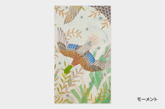古田さんが描く「土地に生息する動物や植物の営み」をもとに、デザイナーがアレンジを行い、さらに熟練の職人による特殊な印刷と箔を施したことにより、立体的で華やかに仕上がりました。