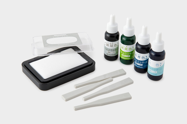 ①パッケージを開け、「いろづくり」「いろもようのインク4色」「ヘラ」を取り出します。ブレンドを始める前に、インクはキャップをしたままよく振りましょう。