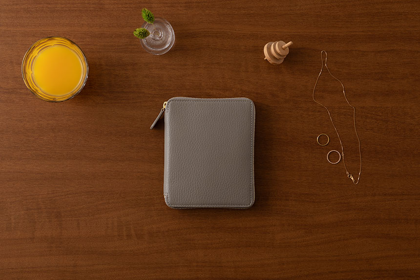 裏地を貼らず、芯材も入れないシンプルな仕上げ。軽くて柔らか、机上でフラットに開きます。