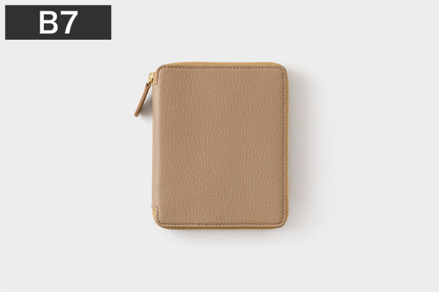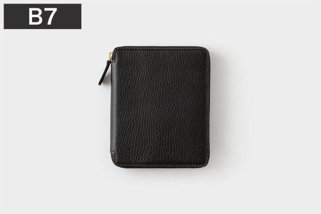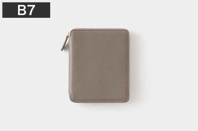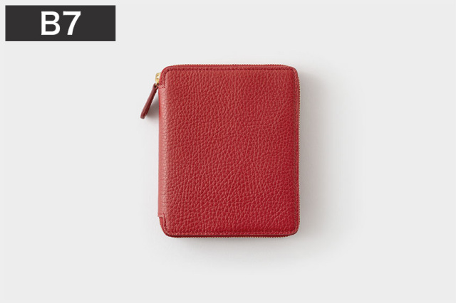 しっとりとした質感のシュリンクレザーは、発色がきれいで手によく馴染みます。中身をしっかりと包み込むラウンドジップ。務歯(金属部分)が繊細で滑らかなものを使っています。サイズは、携帯性に優れたB7。ダイアリーやノートなら160ページ程度の厚みがフィットします。また64ページ程度のダイアリーとノート、2冊を左右の袖に別けて入れてもOK。左袖のカードホルダーには名刺や小紙片などを。ペンホルダー付。手のひらサイズでコンパクト。