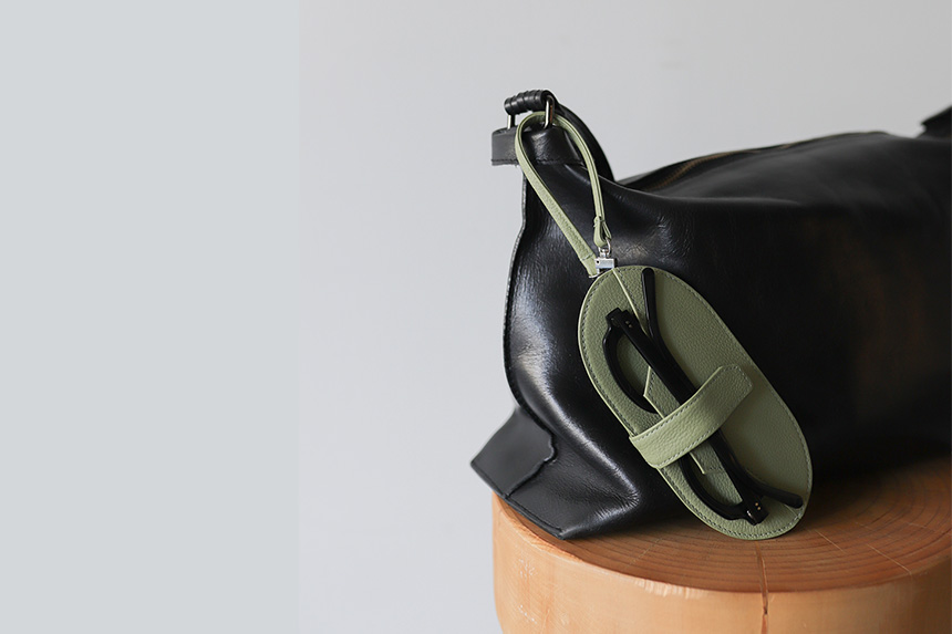 テンプル(=耳にかける部分)を外に出してしまう収納スタイル。テンプルを外に出すことで、大ぶりのサングラスや曲がりの強いテンプルも簡易的に収納可能です。また、ストラップが付いているので、バッグに付けて気軽に持ち運べるのも便利な特徴です。