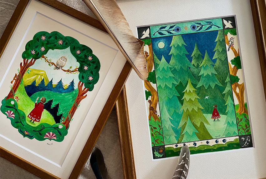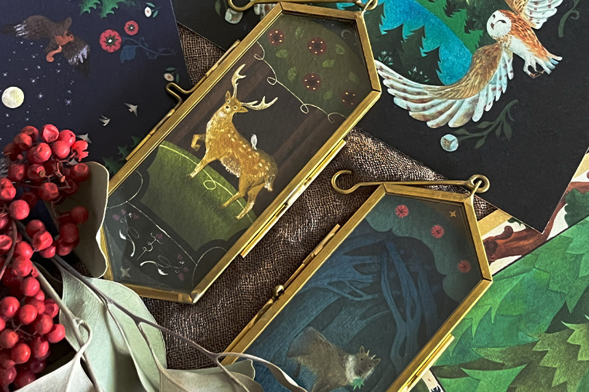 今回の展示では、そんな小さな物語の案内人として“森の賢者”とも呼ばれるふくろうをストーリーテラーに迎え、森をテーマにした原画やジークレー作品のほか、ハンカチやオーナメントなどの雑貨が並びます。
