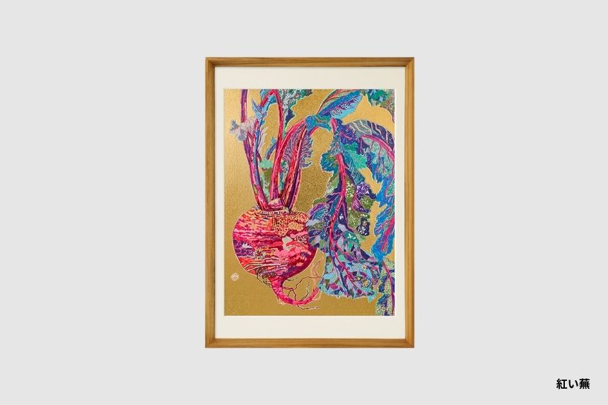 髙橋は、栗原氏が枯れたところに美しさを見出すという哲学に着目。原画で茶色や黄色で描かれていた「茎が枯れて絞られていく部分」を、あえて金の加飾で拾い上げ、作品に新たな解釈を加えました。