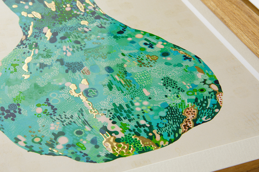 最大の課題は、この岩絵具特有の輝きをどう紙に落とし込むか。通常の印刷ではインクが紙に沈み、色がくすんでしまいます。それは、栗原氏の作品にとってはマイナスでしかありません。挑戦は、まず色が沈み込まない紙選定から始まり、最適な印刷技術、さらに原画の魅力を拡張するため、加飾を施しました。