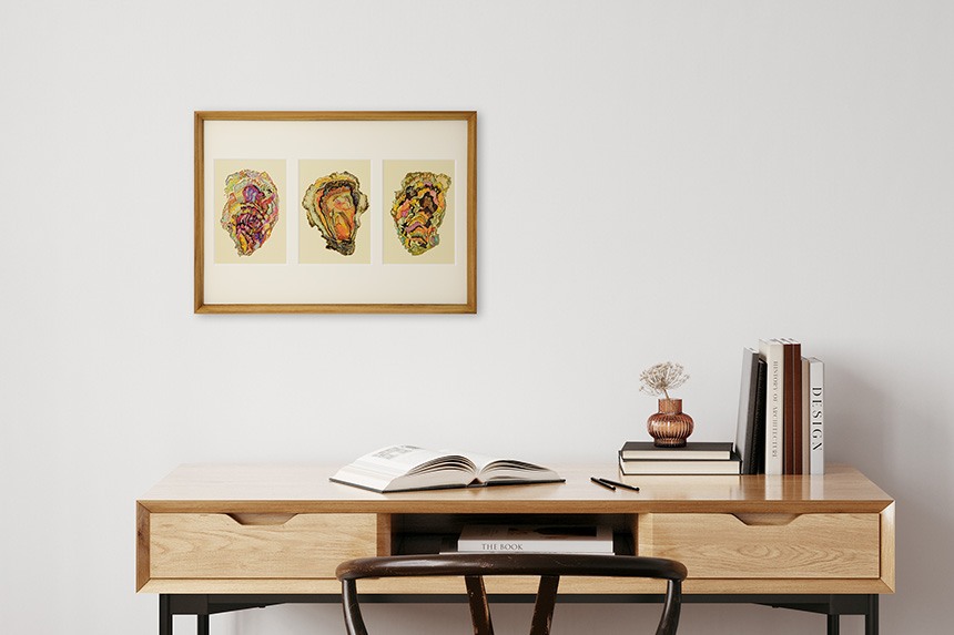 複雑な色彩を表現しながら透明な樹脂で牡蠣のぷっくりした立体感を出し、原画の魅力を触覚で楽しめるようにしました。ちょっとしたスペースでも華やかな印象に。