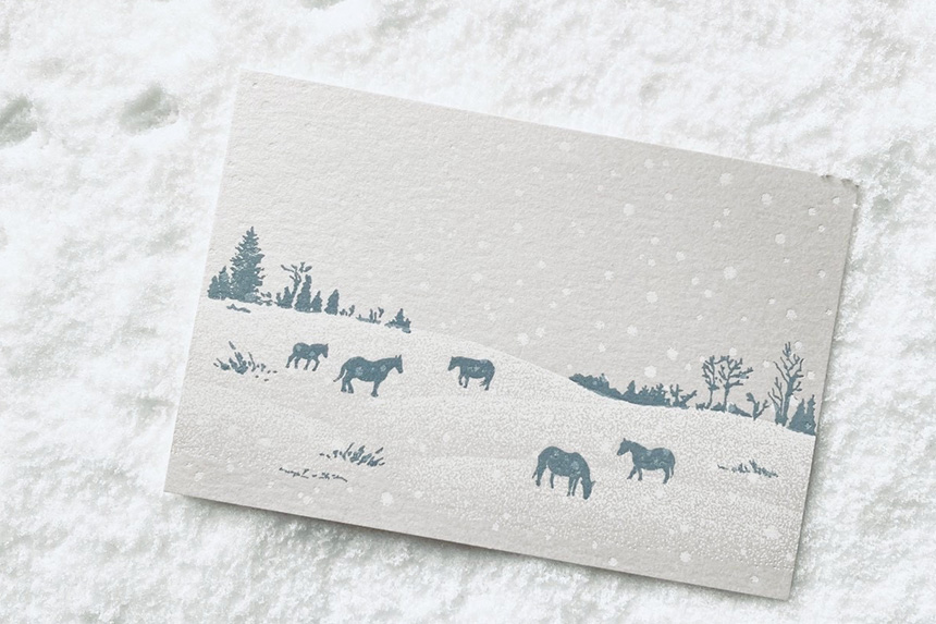 吹雪にも負けない丈夫な体を持ち、必ず訪れる春を信じて長い冬をたくましく超えてゆく北の馬をモチーフにしたポストカード。