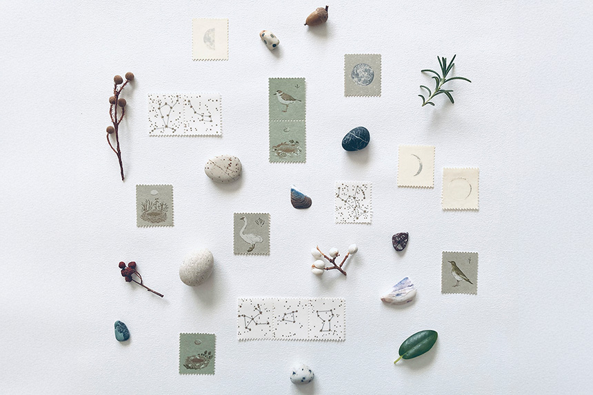 星や動植物、身近な自然の中にあるモチーフなどをテーマに、紙の質感や色、インキの色合いにこだわりながら、活版印刷機で一枚一枚印刷し紙雑貨を制作。